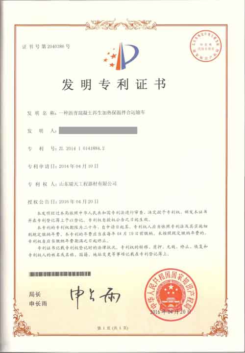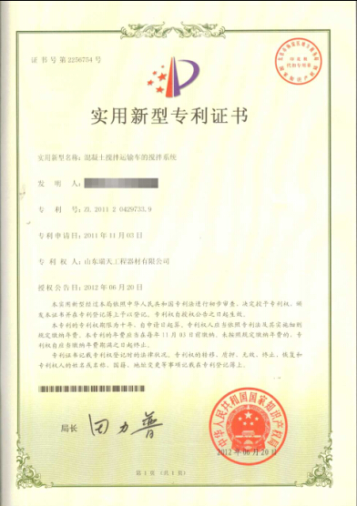 • 混凝土攪拌運輸車實用新型專利證書